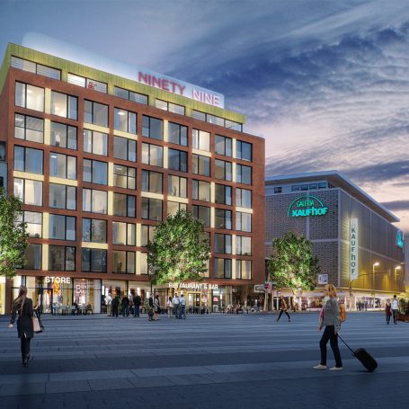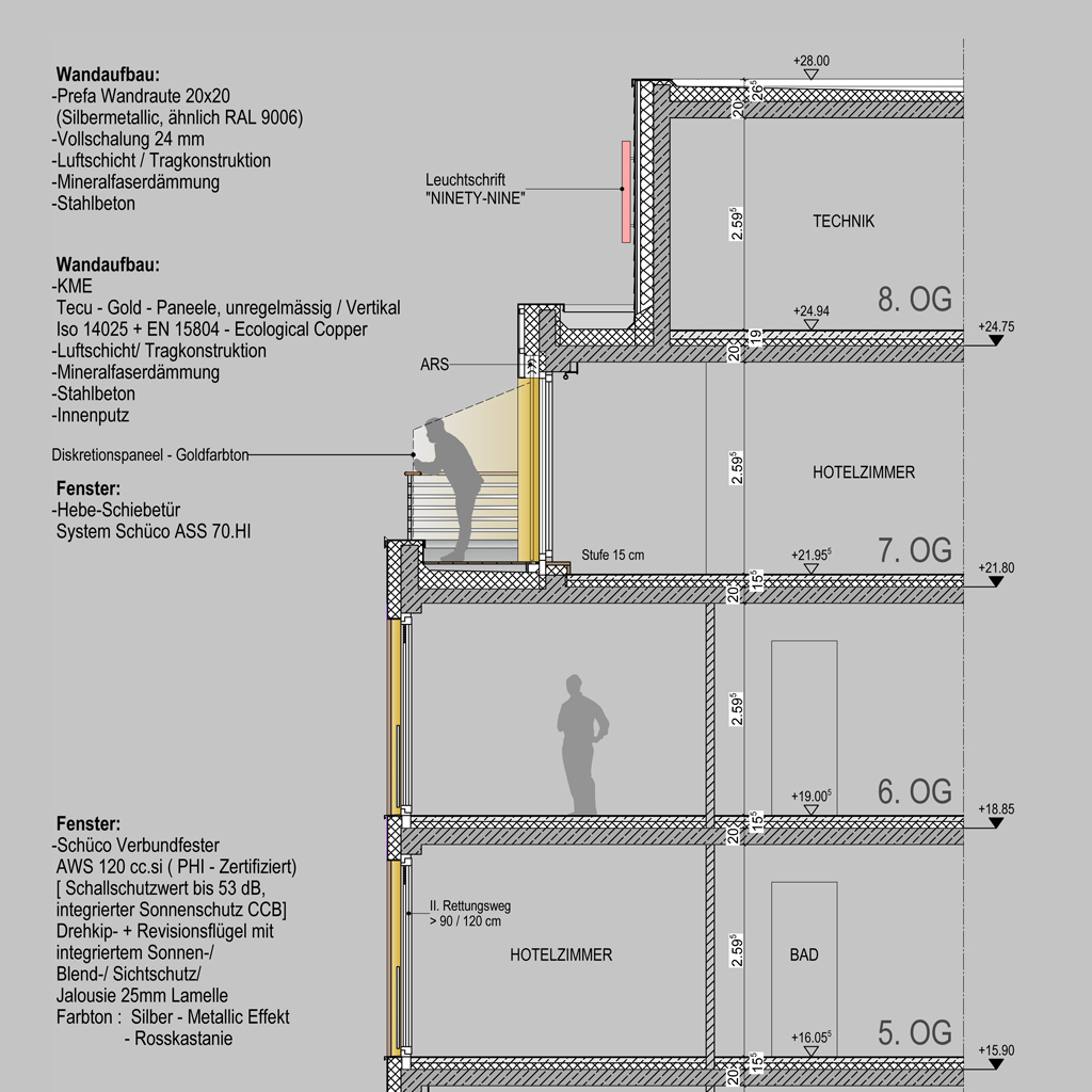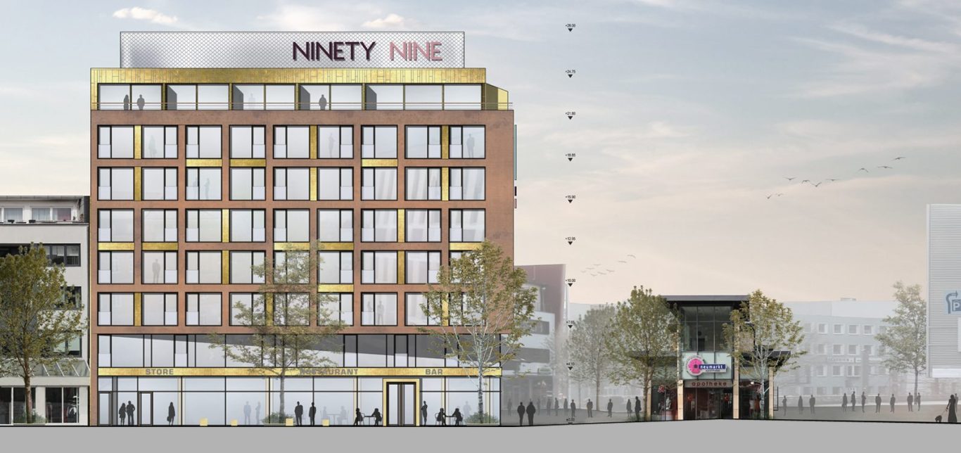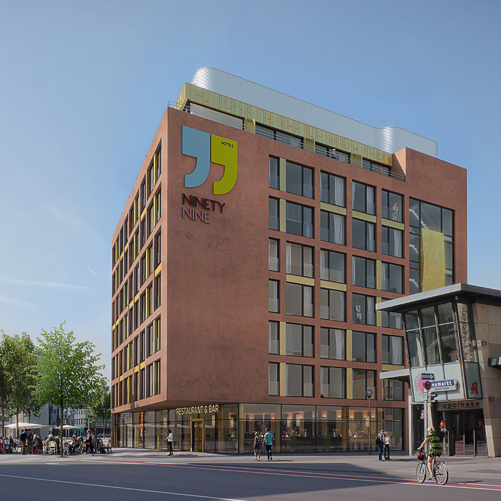 Wettbewerb für die Fassade eines Hotels der Kette 99 in Osnabrück. Das Hotel befindet sich in der Nähe des historischen Stadtzentrums am Neumarkt in einem Gebiet, das derzeit umfassend saniert wird. Die Fassade nimmt die Farben der Klinkerfassade des angrenzenden historischen Gebäudes auf.