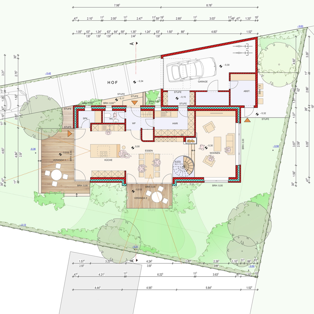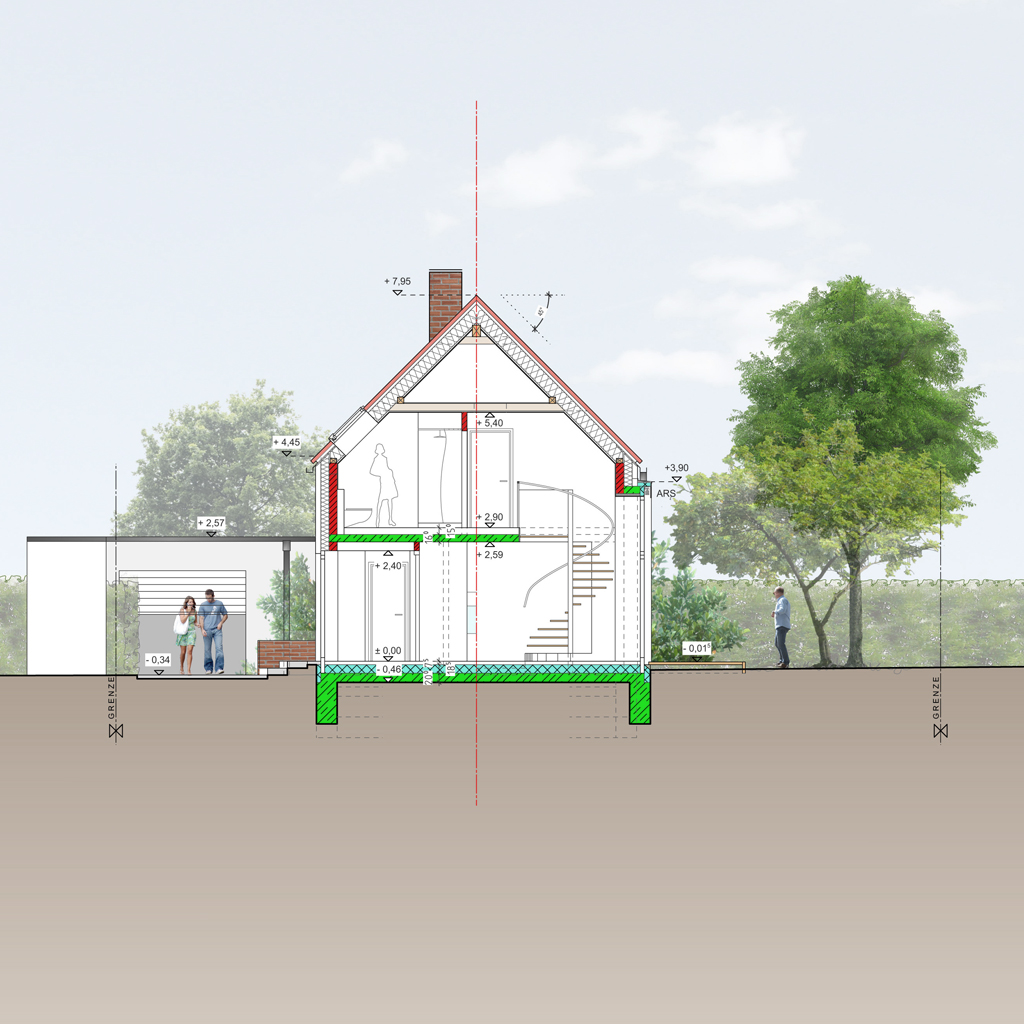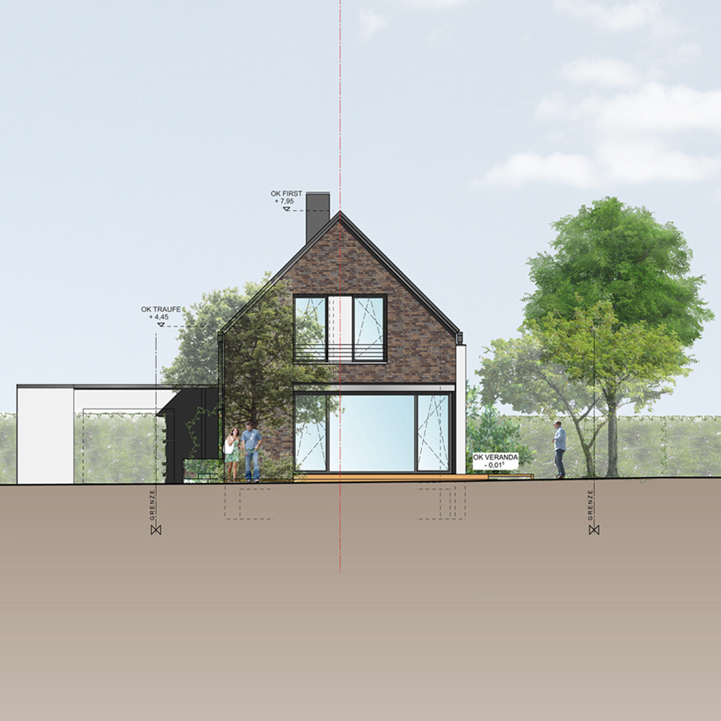 Das Projekt wurde als Angestellter im Architekturbüro Mutert durchgeführt. Das gemeinsam mit Herrn Mutert bis zur Baugenehmigung LPH 1-4 durchgeführte Projekt erfüllt die Anforderungen des Kunden und löst das Problem eines unregelmäßigen und engen Grundstücks.