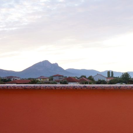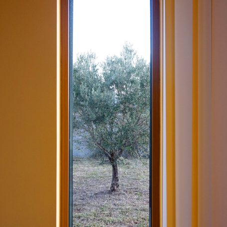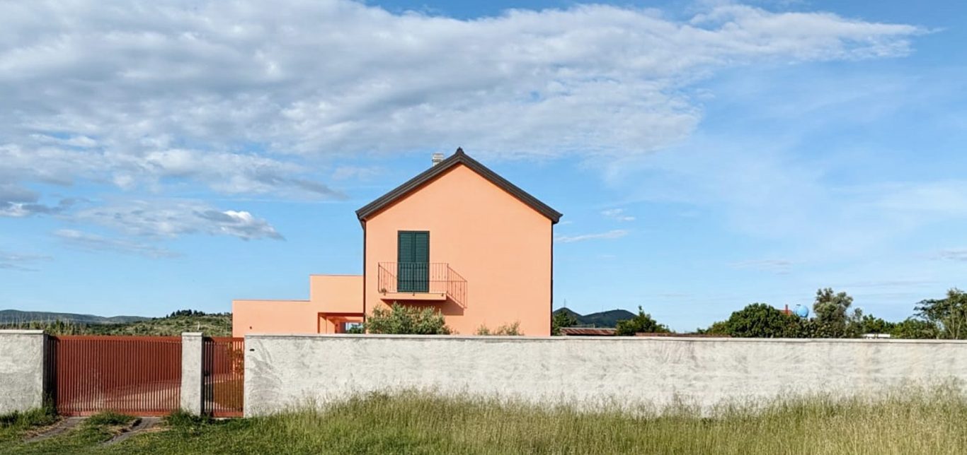Haupteingang und große Fenster sind so angeordnet, dass sie der Sommerhitze und den Auswirkungen des Windes wenig ausgesetzt sind. Die Außenanlage steht kurz vor der Fertigstellung.
