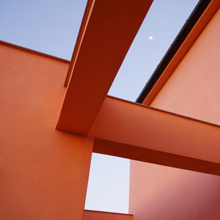 Das Haus mit begrenztem Budget wurde unter Berücksichtigung des Klimas und der Farben der Umgebung entworfen. Die rote Farbe der Erde des Umfelds beeinflusst die Farben des Hauses.